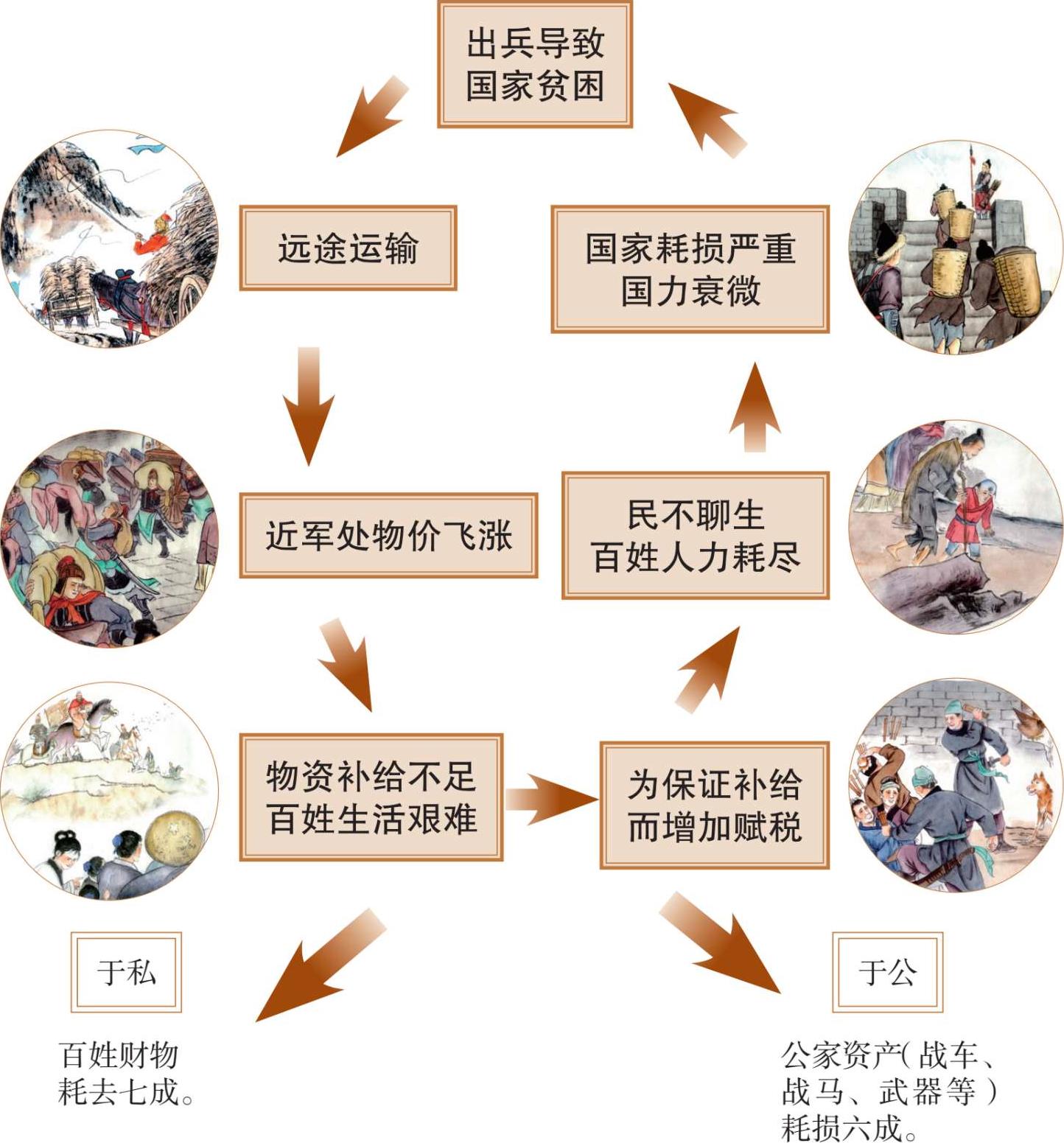 国家之所以会因为用兵而变得贫困,远途运输是重要原因,远途运输就会使百姓陷于贫困。临近军队的地区物价飞涨,物价飞涨就会使百姓财力枯竭,百姓财力枯竭,就更加急迫地征收赋税。国力耗尽,财政枯竭,国内就会家家空虚。百姓的财力,将会耗去十分之七;政府的财力,由于车辆破损、战马疲惫,装备、兵器、战具的补充以及辎重车辆的征调,要耗去十分之六。