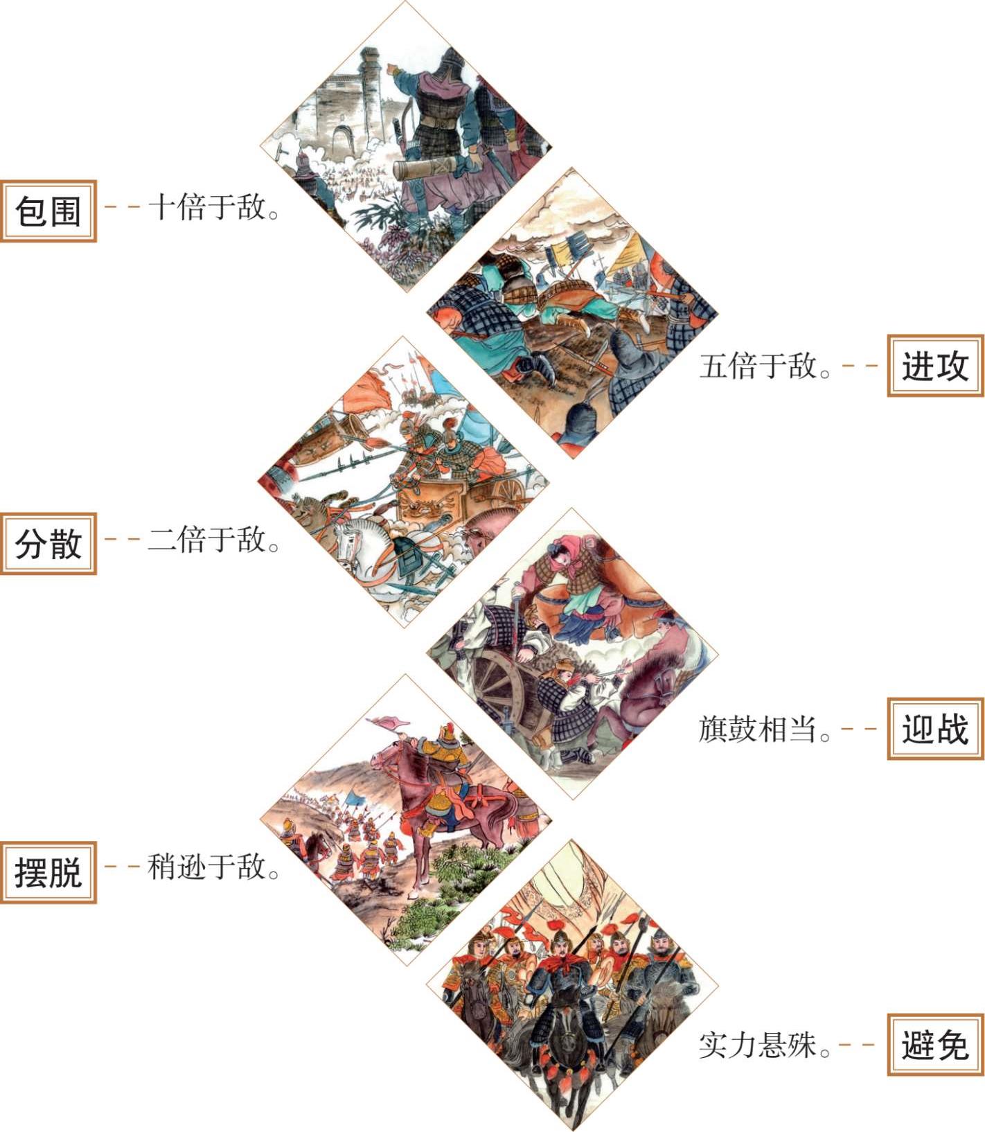 故用兵之法,十则围之 [12] ,五则攻之,倍则分之,敌则能战之 [13] ,少则能逃之,不若则能避之 [14] 。故小敌之坚,大敌之擒也 [15] 。