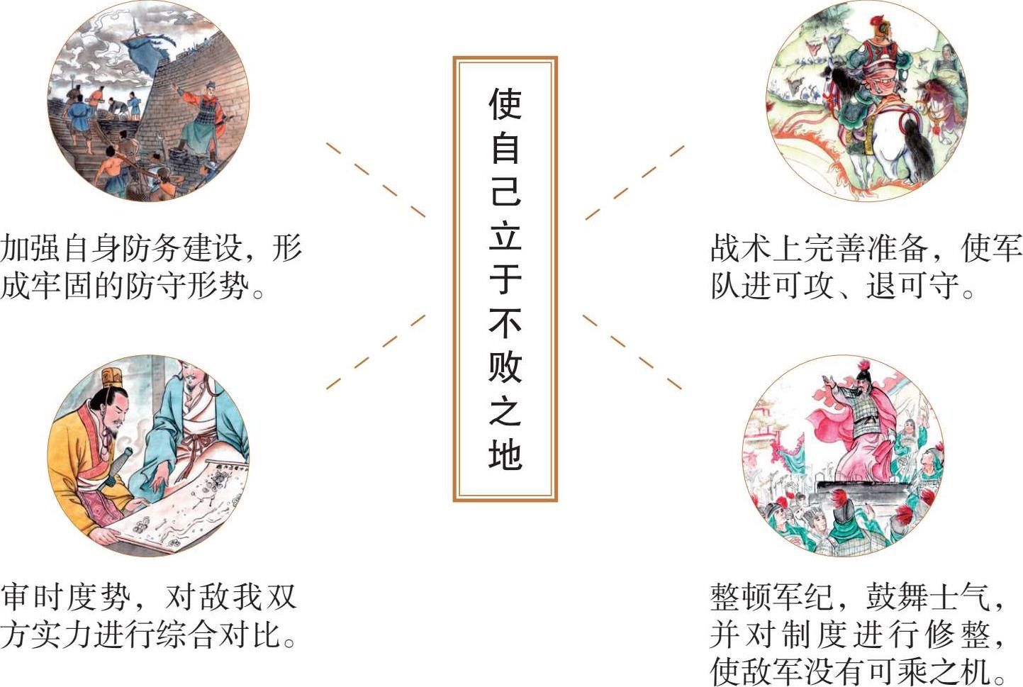 孙子说:从前善于用兵的人,先创造条件使自己不被敌人战胜,然后等待可以战胜敌人的时机。不被敌人战胜的主动权掌握在自己手里,能否战胜敌人则取决于敌人是否留下可乘之隙。所以,擅长作战的人,能(创造条件)使自己不被战胜,而不能保证敌人一定为己所战胜。所以说,胜利可以预见而不可强求。