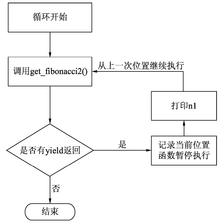 yield一次返回一个数,不断返回多次。先来看一下程序执行的流程图,如图1-10所示。