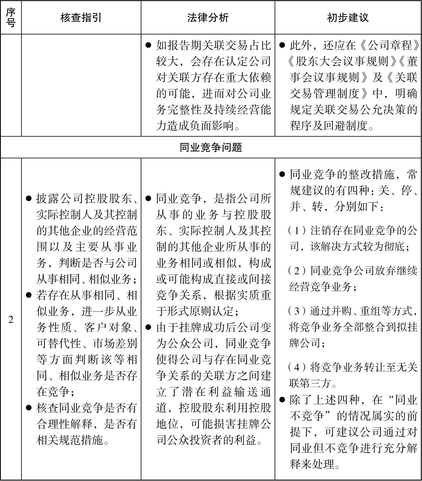 举个例子。新三板项目中关联交易和同业竞争是个重要问题,通常在法律意见书的同一小节即“关联交易和同业竞争”这部分进行核查和阐述,但常有客户对这两者“老虎老鼠,傻傻分不清楚”,认为两者均系挂牌的实质性障碍。事实上,关联交易和同业竞争对申请挂牌的影响性质是不同的。关联交易并非绝对禁止,而是应当尽量减少,对于不可避免的应做到交易真实、定价公允,其“底线”是不能对关联方存在重大依赖,影响拟挂牌企业的独立性。而同业竞争是“红线”,不能踩,存在同业竞争的必须在挂牌前解决此问题。