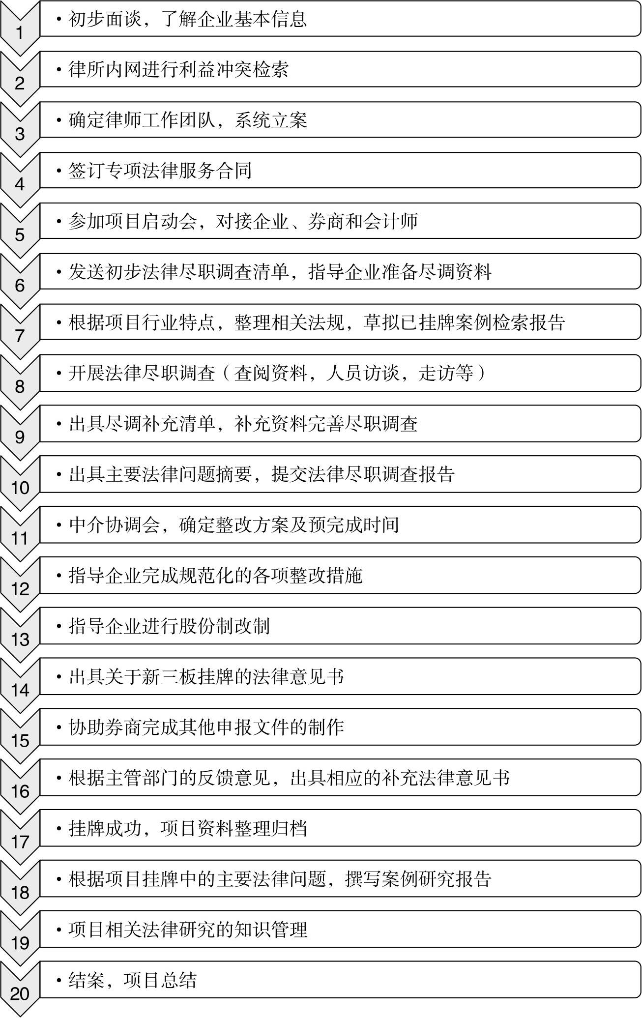 比如,2014—2016年间,我们曾承办了大量中小企业申请新三板挂牌的项目。结合挂牌项目的工作特点,我们将申请新三板挂牌业务绘制为以下流程: