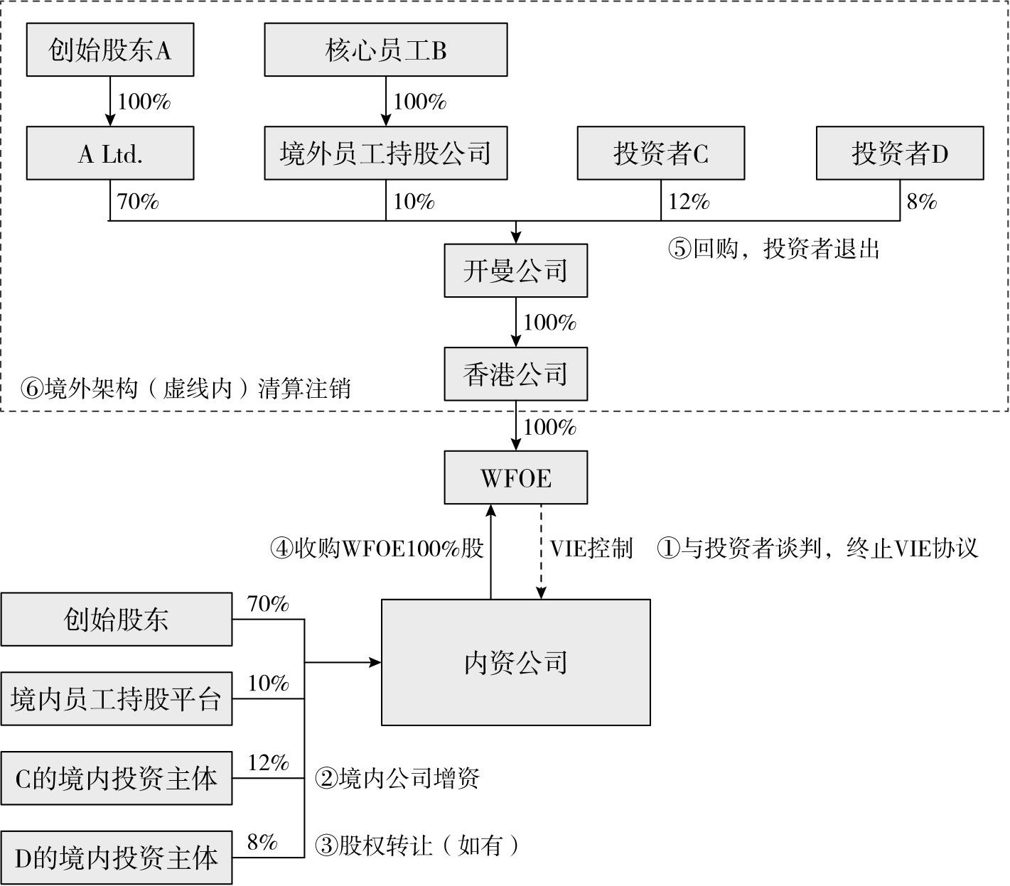 VIE的搭建是个技术活,拆除亦是如此。一般而言,拆除VIE架构主要步骤是:(1)境内公司创始人与境外投资者进行商业谈判,境外投资者或者选择退出,或者选择其境内平行基金在境内公司层面承接出资,并终止相应的VIE协议;(2)境内公司通过增资获得现金,增资来源可以是新投资者,也可以是前述平行基金;(3)境内公司股权结构如需调整,如涉及员工股权激励,同步进行股权转让;(4)通过增资资金收购WFOE(Wholly Foreign Owned Enterprise,即外商投资企业);(5)收购价款以股权回购的形式偿付境外投资者的投资,使其退出;(6)境外架构清算注销,境内WFOE保留或注销均可。