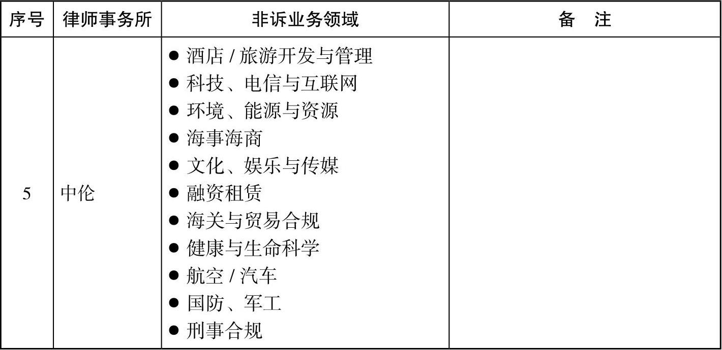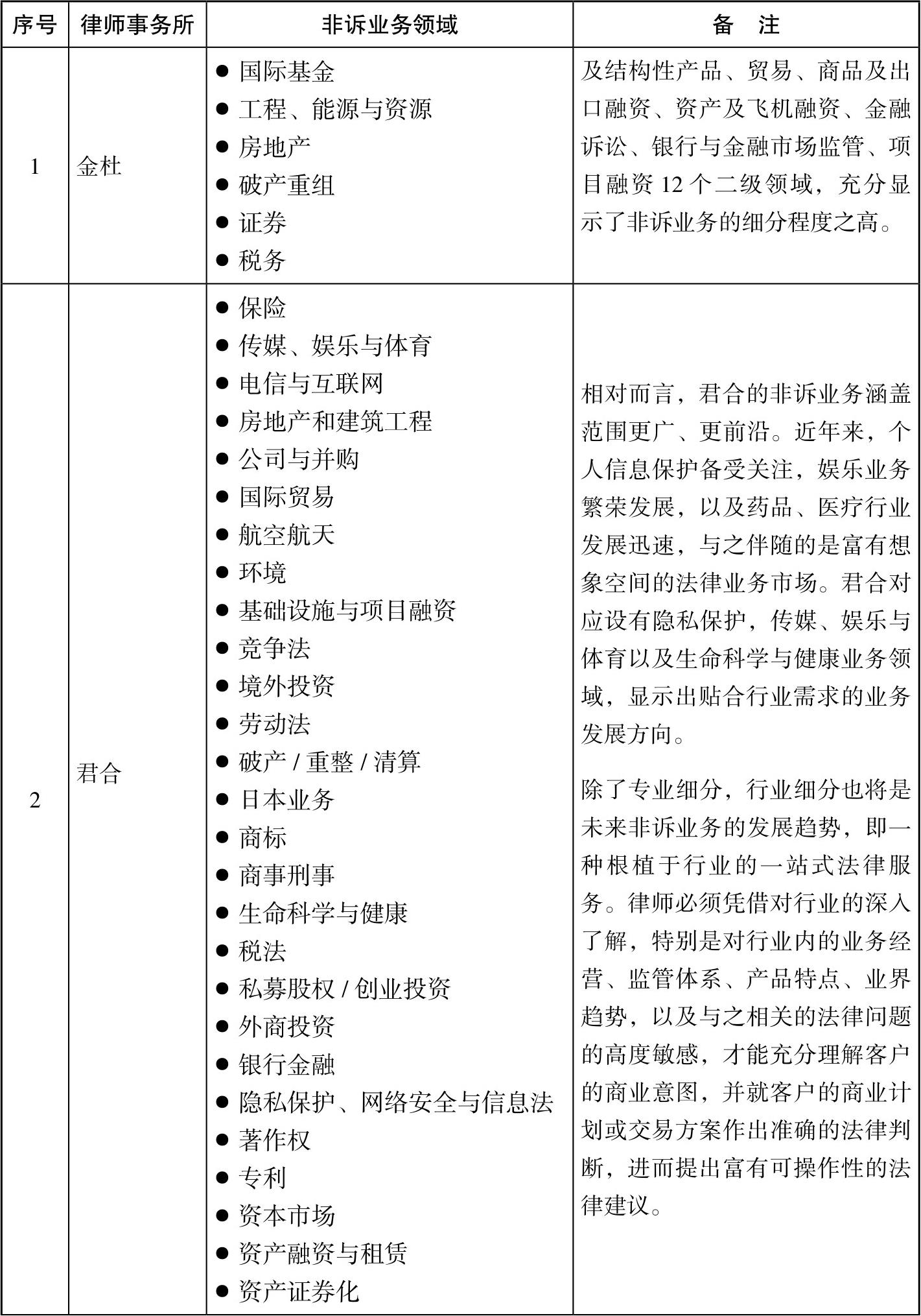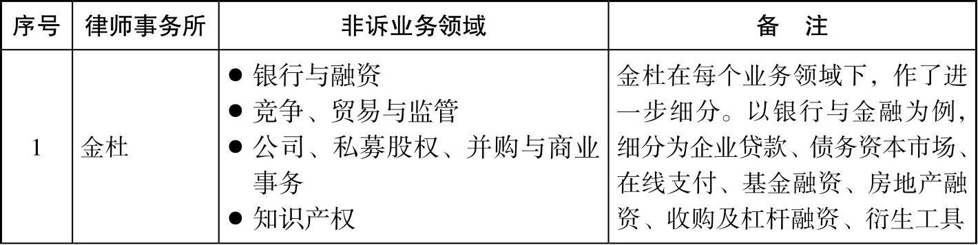 表1-1 金杜、君合、方达、海问和中伦律师事务所的非诉业务领域