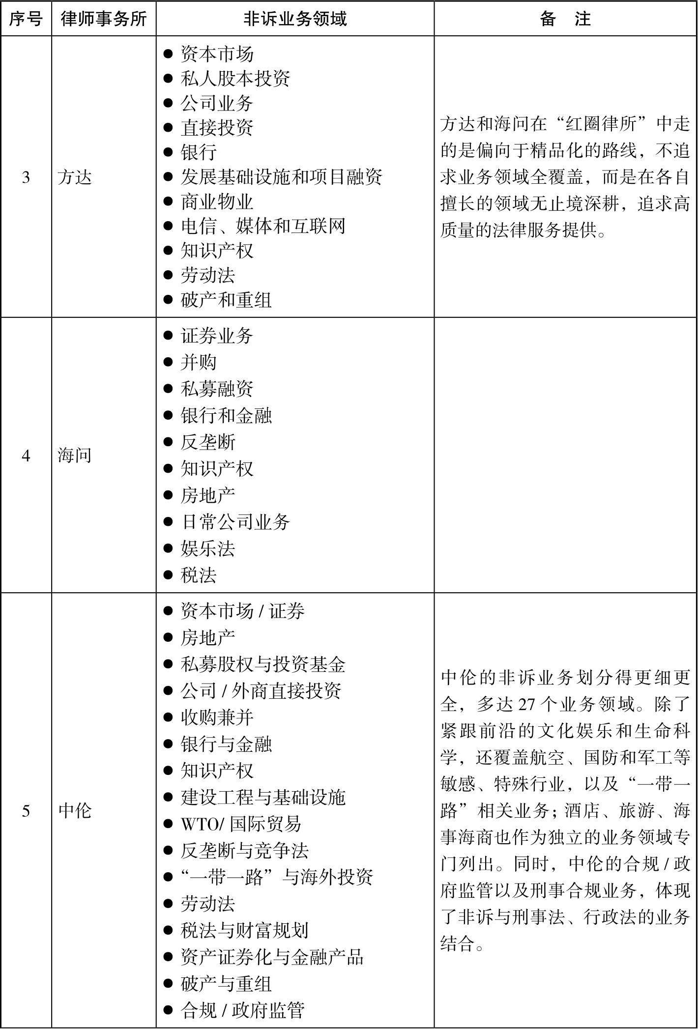 表1-1 金杜、君合、方达、海问和中伦律师事务所的非诉业务领域