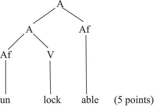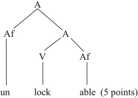 4. The English word unlockable has two different lexical meanings, i. e. “not able to lock” and “able to be unlocked”. The semantic ambiguity of the word comes from structural ambiguity. Give the meaning corresponding to the morphemic structure of the word in your analysis. Draw two tree diagrams to show the difference between the two structures. Lable the nodes in the tree diagram with proper categories. (本题10分)