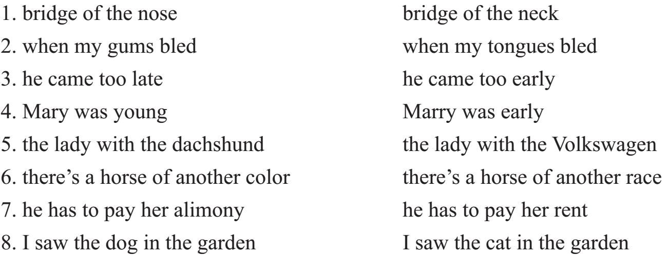 6. 考点提示: 本题考查词的语义特征。在这些口误中,真正使用的词与原词在语义上都有很大的关联性。nose和neck都是身体部位; gums和tongues都是口腔的部分; late,early以及young都是时间的表达方式;dachshund和Volkswagen都与德国相关;color和race都是马的重要特征;alimony和rent都与金钱相关;dog和cat同属于动物。