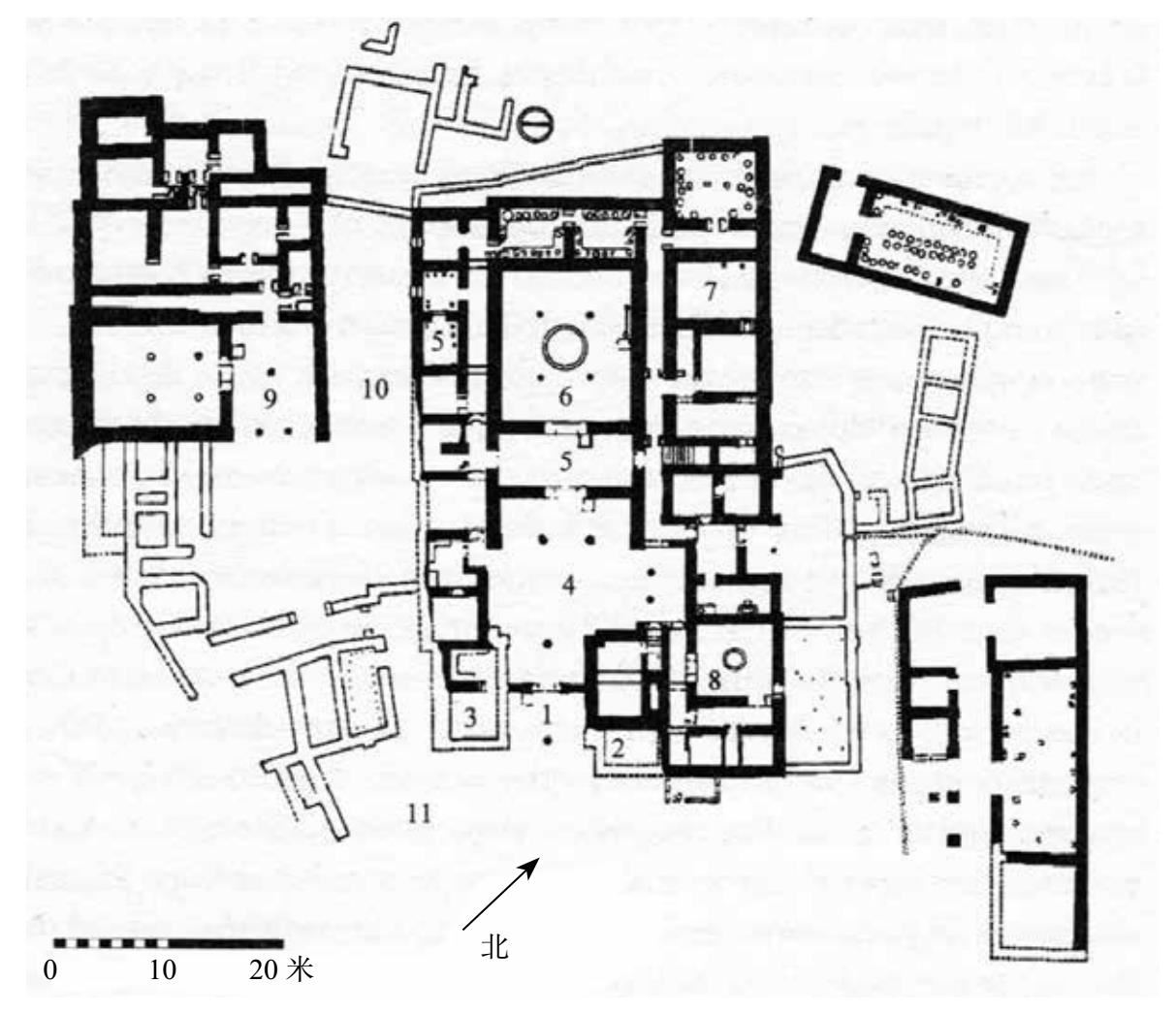 图3 皮洛斯宫殿平面图。加粗的线条表明已经确定的墙壁,中空线条表示墙壁没有得到很好保存。1.入口;2.卫兵室;3.档案室;4.庭院;5.前厅;6.正厅;7.食品储藏室和仓库;8.小一点的正厅;9.西南部建筑的正厅;10.宴会厅;11.宴会区域