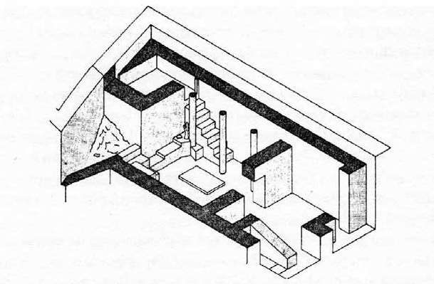 图6 迈锡尼神殿的等距视图,从西南方向看。主要房间为5.1米长,4.3米宽