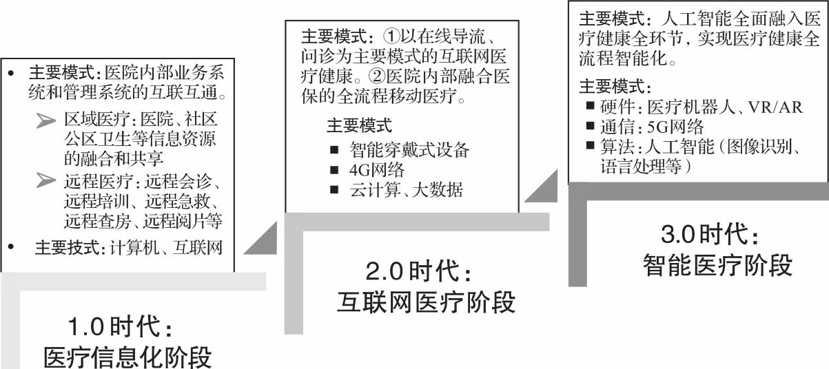 医疗健康信息化的技术进化史可以分为三个阶段(见图1-1)。第一个阶段是医疗信息化阶段,通过计算机、宽带网络等技术实现医院信息共享和区域医疗信息共享;第二个阶段是互联网医疗阶段,借助可穿戴设备、4G网络、云计算、大数据等技术,实现以在线导流、问诊为主要模式的互联网医疗以及医院内部融合医保的全流程移动;第三个阶段是智能医疗阶段,人工智能技术全面融入医疗健康全环节,借助医疗机器人、虚拟现实、增强现实、5G网络、人工智能等技术,实现人工智能辅助诊断、远程手术等业务模式,实现医疗健康全流程智能化。当前,医疗信息化正处在从互联网医疗向智能医疗过渡的阶段,智能医疗时代的曙光已经到来。