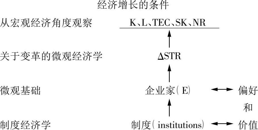 然而,所有上述分析都还不能真正解释为什么有些社会比其他社会积累了更多的物质资本和人力资本。为什么人们会储蓄、投资、开发自然资源、学习技能。或为什么会不这么做?70 年代,一些经济学家观察收入水平的上升在经济活动的结构成分中导致的系统变化:当收入(工资)水平很低的时候,具有增长优势的是劳动密集型产业;而当收入水平上升时,则是资本密集度和技术密集度较高的产业具有增长优势。国民产品的结构突出了一个事实,在总的宏观经济增长现象背后,事实上存在着各种有机演化的微观经济结构。价格高度灵活和要素高度流动的经济一般比僵化的经济增长得更快。因此,结构变迁(ΔSTR)被视为增长过程的重要组成部分。与此同时,企业家( E)在经济进步中的作用和竞争的重要性也得到了经济学家(如约瑟夫·熊彼特和以哈耶克为代表的奥地利学派)的关注。企业家被认为是动员生产要素、冒险对知识进行创新性应用、并去尝试结构变革的主体。