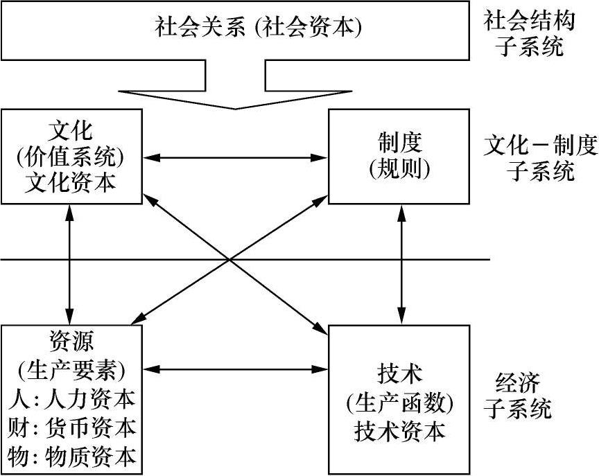 通过这个新的框架,我们可以看到,三个方面的要素促成了经济发展。在经济方面,人力资源( human resource )、物质资源( physical re sources)和技术( technology)构成了生产的基本要素;在文化/制度方面,价值观念和制度规范为一个社会的经济运行提供了软性环境和制度保障;在社会结构方面,人与人之间的社会网络关系和组织行为,为交易所需要的人与人之间的信任和合作提供了可能。