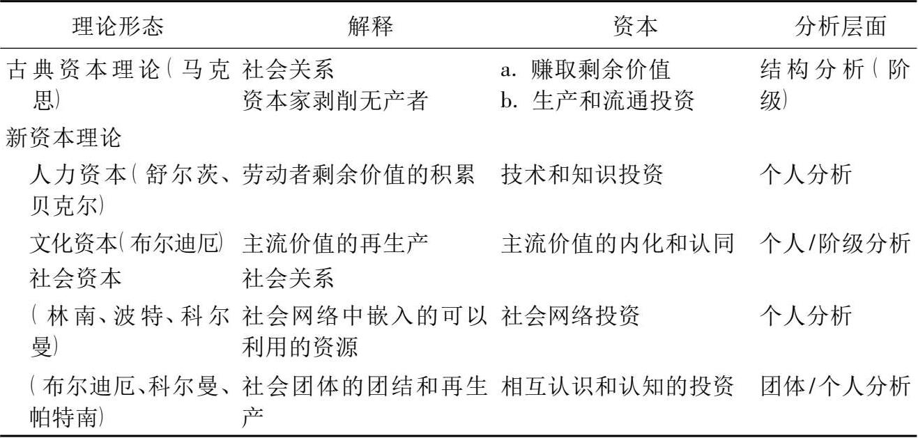 美国杜克大学社会学教授林南在回顾资本理论发展历程的同时,曾经对不同的资本理论形态作了简要的概括总结(如表 1-1 所示)。