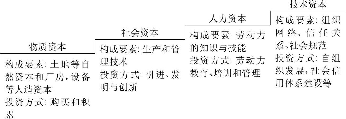 人们一直致力于探讨社会经济发展的根源,从最早关注物质资本(自然资源:土地、矿产等),到后来看重技术资本(技术资源:技术的改造和创新),再到后来关注人力资本(人力资源:劳动力的管理与开发),直到近年来又将研究目光聚焦于社会资本(社会关系资源:社会结构和人与人的社会关系网络),这反映了人们对于促成发展的资本要素的认识越来越全面深刻。下图(图 1-5)概括并反映了人们对于资本及其投资的认知过程,它向我们显示了资本积累的内容和投资的途径: