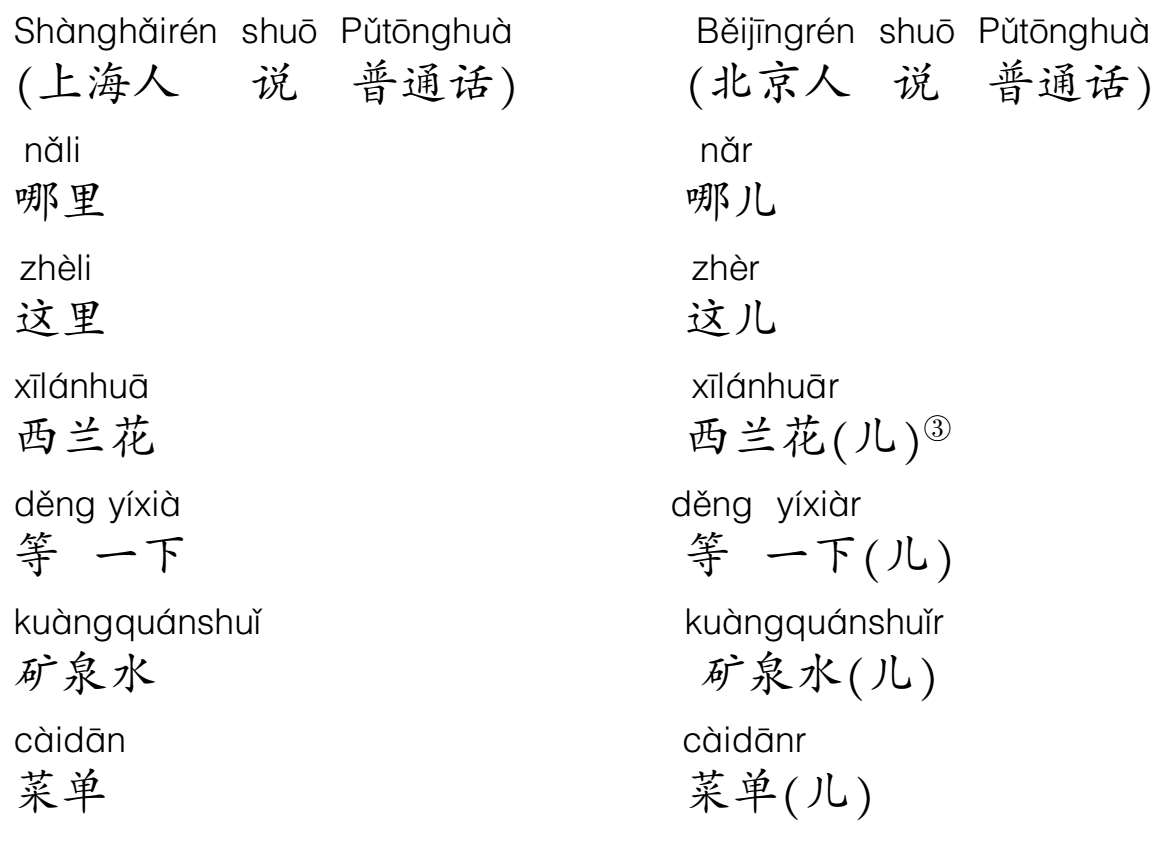 ③In regions where the“-r”soundis popular,the Chinese character 儿 is sometimes omitted in the written form.However,its pinyin spelling“-r”is still required.