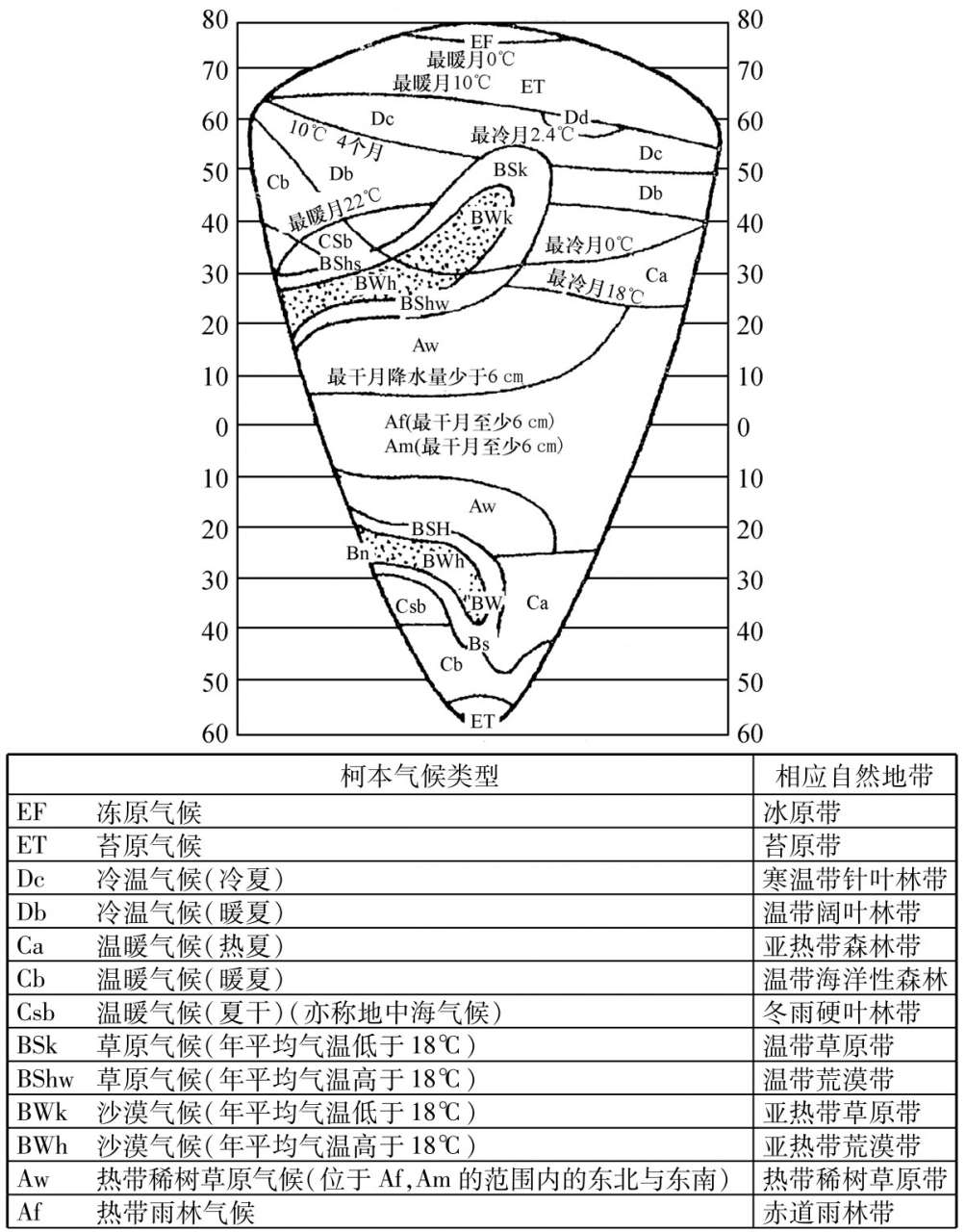 它是研究气候的特征、形成、分布和演变的学科。由于各种仪器的发明,提供了准确的与可以比较的量化数据,加上气象学的发展,使人们对气候的形成原因有了深入的了解。广大区域与全球的观测数据的汇集出现了全球的等温线图。在20世纪初,德国学者柯本根据气候同植物的关系,对世界的气候进行了分类并于1936年作出假想大陆气候示意图(见图1-2)。它使人们可以从全球规模上去认识地球表面气候类型分布的规律性现象。