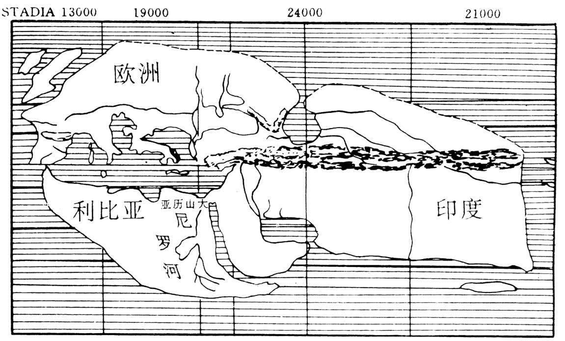 埃拉托色尼是杰出的地理学家,是他将希腊语中“Geographica”作“地理学”,他根据埃及在一条子午线上两地于夏至日太阳阴影长度的比值,算出约为39600km。此数据与实际周长十分接近。其次他接受前人关于欧、亚、非三洲分为五个温度带之说,给出数理界限。并在已知的世界地图上加上七条经度、七条纬度,他开创了用经纬度的科学方法制图之先声,如图1-1所示。