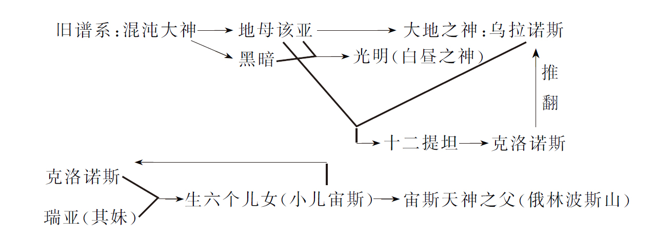 从这个图表上各位可以看到,按照旧神谱的记载,最早宇宙间混沌一片,天地不分,只有一个神叫混沌大神,混沌大神最先生出了大地——就是地母该亚,接着在大地的底层出现了黑暗与黑夜,两者结合生出了光明与白昼。地母该亚又生出了天空,就是天神乌拉诺斯。地神该亚和她的儿子乌拉诺斯结合生出了六男六女,叫做十二巨灵神,又叫做十二提坦。这十二个巨神彼此结合生出了日月星辰。在提坦巨神中,普洛米修斯抟泥做人,创造了人类,并且把天火盗给了人类。乌拉诺斯是第一个统治宇宙的天神,后来被他和地母生的最小的儿子克洛诺斯推翻。为什么呢?因为乌拉诺斯想永远做天神,他担心他的孩子们取代他,就一个一个地把他们吃掉,在地母该亚的保护和支持下,小儿子克洛诺斯起来推翻了他的父亲。克洛诺斯和他的妹妹瑞亚结合,生下了六个儿女,这时候克洛诺斯担心自己的统治被自己的儿女推翻,又把自己的儿女一个一个地吞食。作为母亲的瑞亚把最小的儿子宙斯藏了起来,宙斯终于推翻了自己的父亲,成了宇宙的统治者。从这个旧神谱当中我们可以看到两点:第一,这个时代还处于人的蒙昧时期,还是一个杂婚制的时代——母亲可以和儿子结合,哥哥可以和妹妹结合。同时这个时代还有人吃人的野蛮风气。关于这个时代,有兴趣研究的同学可以看恩格斯所写的《家庭私有制和国家的起源》。第二,当时的原始初民们对于天地的起源有一个很天才的猜想,就是天地在初始的阶段本来是混沌一片的,这样的猜想和我们中国神话里的记载是大体一致的。我们中国的古书也讲,最开始“宇宙如鸡子”,老子也说“天地始于一,一生二,二生三,三生万物”,这样的一种对于宇宙最初状态的看法跟我们现在科学的系统论的观点是吻合的。大家想想,在近代科学中,比如说在牛顿的科学著作中,对宇宙的起源不是这样看的。牛顿开辟了近代科学的新时代,功劳是极大的,但是他在某些方面,由于强调了机械的分析,反而不如原始初民的看法更接近于自然本身。这也是一个很值得我们深思的事情。类似的例子还有一个,希腊神话中说,普罗米修斯用泥土来做人,做了人形以后要由智慧女神雅典娜吹一口气给他智慧,然后这个泥人就可以变成一个活的人了。这样的说法作为神话是很有趣的,但是作为人类的起源我们从来都认为它是荒谬的。按照进化论的观点,我们人类最初的起源应该从蛋白质讲起。而泥土呢,属于矿物质,是无生命的。但是,最近有一位美国科学院的院士提出了一个报告,认为人类起源于泥土。这个报告所提出来的观点,不一定就是对的。但是我们也不能认为他就是在那儿无根据地胡说。至少有一个观念我们要提出质疑:就是把自然界分成有生命的和无生命的,并认为它们之间存在着一条截然不能逾越的鸿沟对还是不对?是否符合事物在一定条件下相互转化的辩证法?