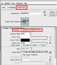 为了能够在Persp视图中清晰地观察,通常还要将参考图片只显示在Side一个视图中,而不在其他三个视图中显示。选择参考图片“AK47参考图01”,展开它的属性面板,进入ImagePlane1选项卡,在Image Plane Attributes(映像平面的属性)菜单中,点选Display(显示)下的looking throuth camera(只在本摄像机中可见),即可关闭参考图在其他视图的显示模式,而只在导入图片的Side视图中可见,如图3-6所示。