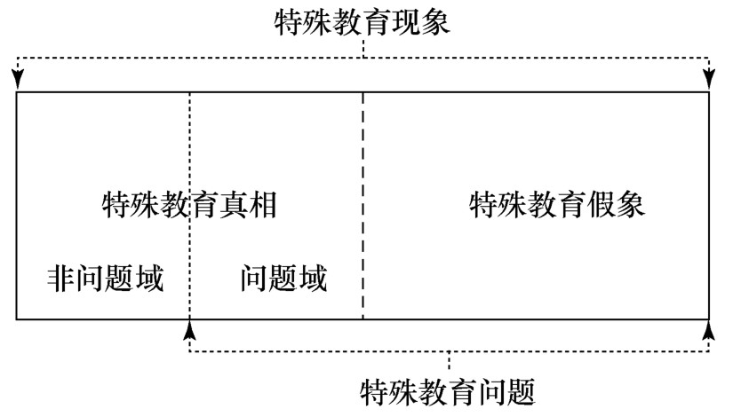 其次,特殊教育真相与特殊教育问题的关系。很多人认为,特殊教育真相中并没有特殊教育问题。笔者认为,特殊教育真相中有特殊教育问题,但不是所有特殊教育真相都是特殊教育问题。例如,教师作为教育者按照特殊教育本质的要求在遵循特殊教育规律的基础上培养学生,但是其在实践中运用的特殊教育方法出现不妥时,就会出现教育问题。即教师遵循了特殊教育规律,领会了特殊教育的本质,但他不一定能把特殊儿童培养好。如果用日常生活中的事例来说明的话,就是我们平常所说的,好人并不一定能办成好事。为什么会出现这一结果呢?原因在于好人还必须要用自己的脑子来想出好的方法。因此,我们可以把特殊教育真相分为“问题域”和“非问题域”。“问题域”就是特殊教育真相中存在的特殊教育问题领域;“非问题域”就是特殊教育真相中存在的不属于特殊教育问题的现象领域。既然特殊教育真相中包括“问题域”与“非问题域”,那么特殊教育真相中的“非问题域”有无必要进行研究呢?这些“非问题域”的特殊教育真相也需要予以研究,以便更好地认识特殊教育的本质。例如,很多成功的特殊教育经验的推广,就是对特殊教育真相中的“非问题域”进行研究的结果。如果一门学科只研究问题,就可能出现“头痛医头,脚痛医脚”的局面,研究者就会处于一种被动状态,跟着问题转,缺乏应有的主动性。