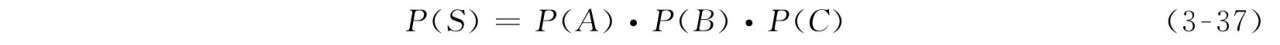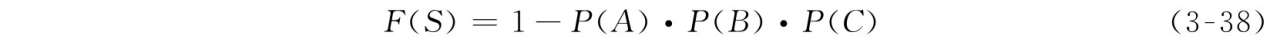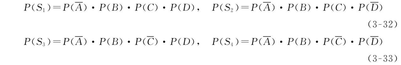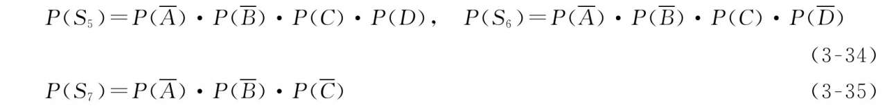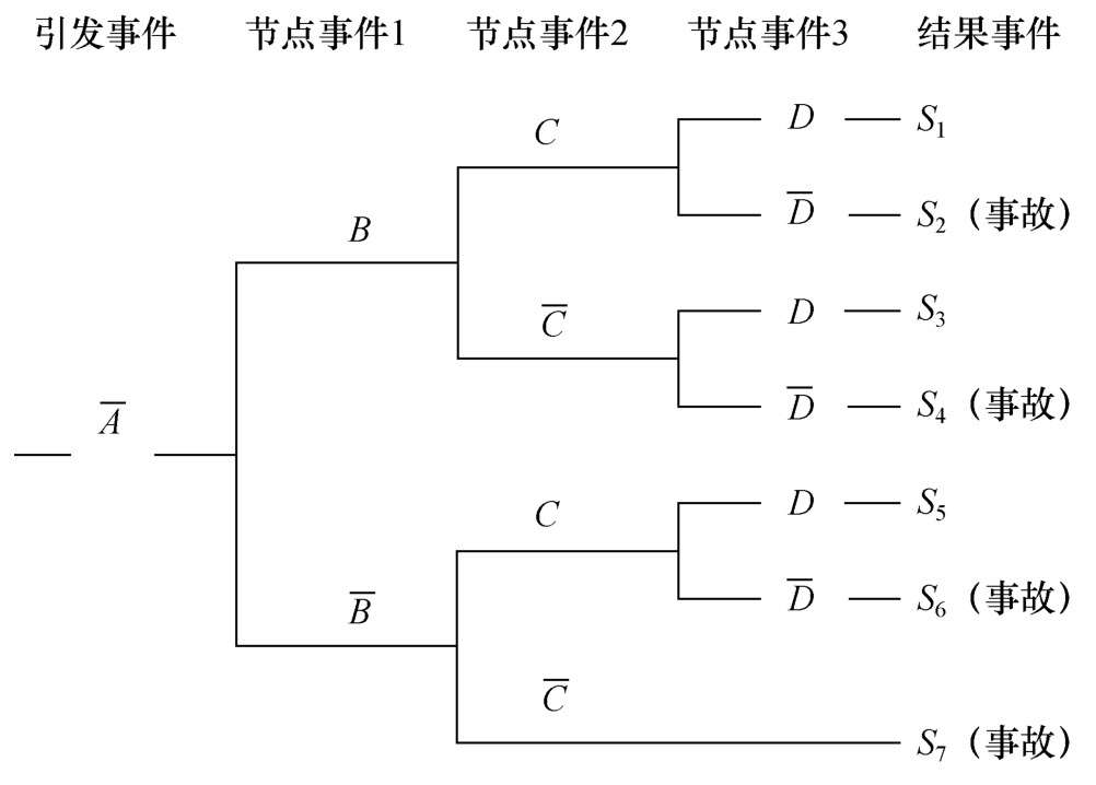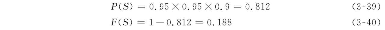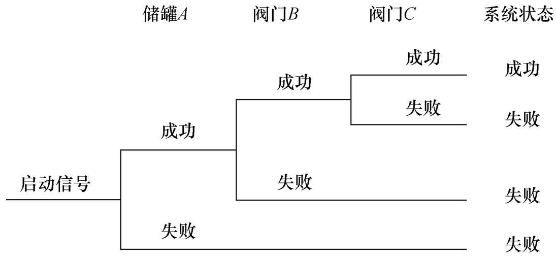 当事件树图画好后,就可以针对此图进行定量分析了。首先要确定事件树中各节点事件成功或失败的概率,然后计算每条事件途径的概率,它等于该途径中自引发事件开始的各事件发生概率之积。以图3-3中的事件树为例,各结果事件对应途径的概率为