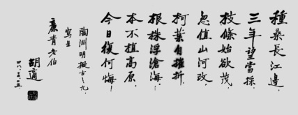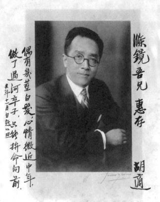 1939年胡适送给来访的新任驻古巴公使李迪俊的照片,照片左侧题诗源自1938年10月31日胡适题赠陈光甫照片诗:“偶有几茎白发,心情已近中年,做了过河小卒,只许拼命向前。”