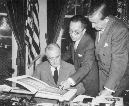 胡适向美国总统罗斯福说明中美友好万人签名书。