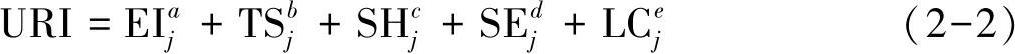 式中, a 、 b 、 c 、 d 、 e 分别表示经济与产业发展、交通设施与安全、休闲服务与接待、休闲空间与环境、休闲生活与消费的偏弹性系数。从式(2-2)中可以看出,该函数体现的是城市休闲化各变量指标之间的非线性集聚机制,强调了城市休闲化各指标协调发展的重要性。
