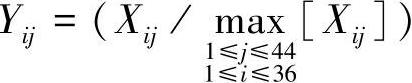 在指标数据处理上,由于评价指标含义不同,各指标量纲处理差异比较大,所以不能直接使用各指标数值进行评价。为了使数据具有可比性,采用最大元素基准法对指标数据进行无量纲处理,将实际能力指标值转化为相对指标,即