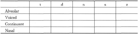 2. The distinctive features tell us the similarities and differences between phonemes or classes of sounds. Now can you fill in the following table with "+" or "-" so that the difference among /t, d, n, s, z/ can be clearly demonstrated.