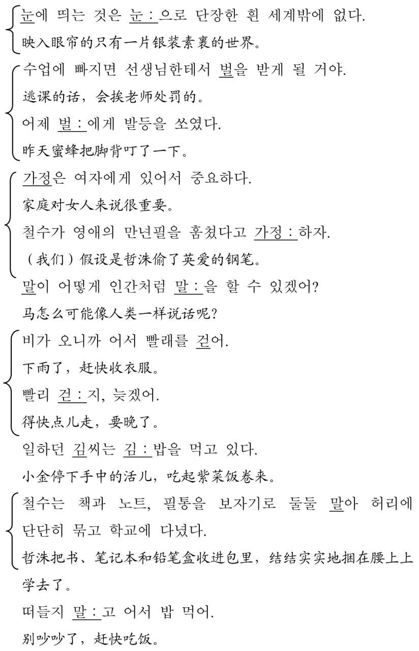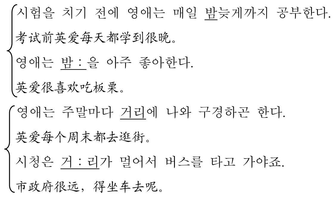 但是声调也不能机械地作为一种衡量标准,将前后音节进行比较后才能确定。如前所述,单音节词在独立发音时,难以判断其意义。例如,韩国语中的“말”,就有“话语、斗、马”三种意义,虽然有的方言有声调的区别,但它在独立发音时,很难看出其所指含义。然而,若在其后添加具有声调的要素或平调的主格助词“-이”,以此形成对比,就可以发现其含义。