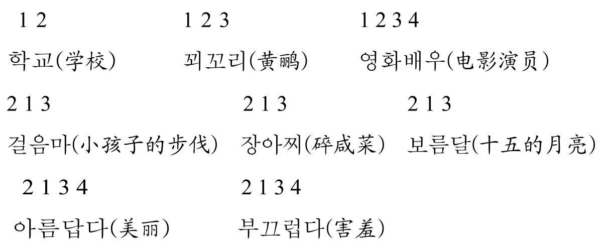 重音在韩国语中的作用与英语不同,它并不是一种区别意义的手段。英语“increase(增加)”,若重音位于第一音节,是名词;若重音位于第二音节,则为动词。但韩国语“학교”,无论重音位于哪一个音节,它的词义和词性都不会发生变化。需要指出的是,韩国语中的大多数多音节词往往都有重音出现,并有以下几个特征: