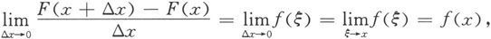 因为当∆x→0时,x+∆x→x,从而ξ也趋向x,利用f的连续性便得