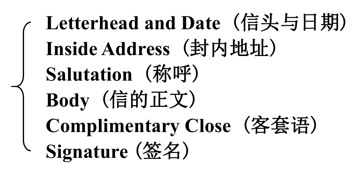 信函的各部分,包括日期、封内地址、事由和结尾礼词,每行开头都与左边空白边缘看齐。