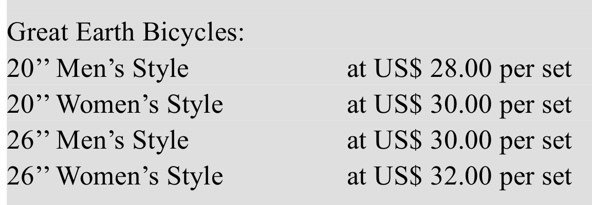 We thank you for your enquiry of November 10th for mountain bicycles of Great Earth Brand.