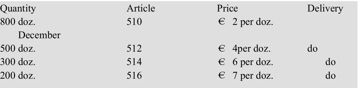 Please also bear in mind that as prices are far from constant here, it will be important that you are able to deliver consignments soon after receiving the relevant orders. Please also let us know how long you normally take to ship consignments.