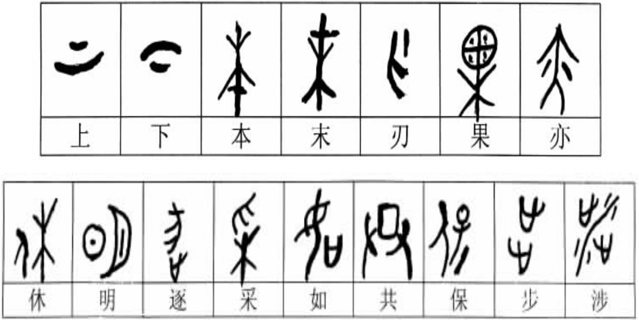 直观构形法体现的是文字创造者对于事物的观察结果,是一种基于直接经验的做法。世界上能够被直接观察到的事物在数量上是有限的,更多的事物是无法直接观察和描画出来的。因此,发现、了解那些事物的特点,根据它们的特点来构造新的汉字,就体现了古人复杂的、抽象的思维能力。通过分析对象,找出对象的特点,然后在该对象所处的环境中寻找相关的条件作为参照,加以巧妙利用,从而造出新的汉字,这是分析构形法。传统“六书”理论称之为“指事”。比如“刃”字,就是在象形字表示刀口的部位加一个记号来引导读者注意刀口这个位置;“本”字,是在象形字“木”的下边根部位置加一个记号来表示树根。