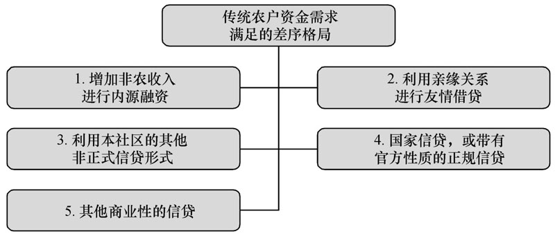 第四,传统农户解决资金困境时遵循特殊的差序格局和圈层结构,从而导致传统农户保持对于现代商业性金融体系的疏远。由于传统小农经济下的农户对家庭的依赖性,因此,只要这种以农户为核心的借贷决策体系不发生根本的变化,传统的借贷方式仍旧在很长时间内存在并延续。根据我们以上的论述,当一个农户出现流动资金短缺时,也就是来自于农业的收入不足以满足其生活消费的需要,它首先会寻求一种内源融资的方法,即寻求各种增加非农收入的方法。当各种非农收入作为“拐杖”仍然不能满足家庭开支需要的时候,就会向亲友借贷,即利用自己的亲缘关系,运用各种非正式的借贷方式来借款,而且借款一般还是用于消费性活动。如果来自亲缘关系的非正式借款也不能满足,则会寻求一些来自本社区的其他资金来源形式,比如参加本村的互助会,或者转向高利贷。尽管高利贷使农民背上很重的偿还负担,但是农户还是在很大程度上依赖于这种借贷形式。当来自于本社区的其他资金来源还不能满足资金需求的时候,农户会寻求国家信贷的帮助,比如各种正式的属于官方的金融组织(比如在历史上存在的国家赈贷)。只有在不得已的情况下,传统农户才会选择商业信贷。因此,在传统农户的信贷差序格局中,遵循着如图3-2所示的顺序。