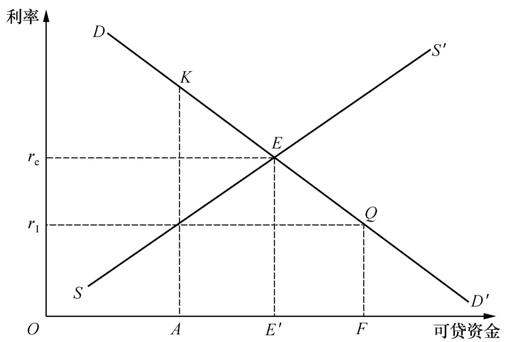 我们可以根据图3-3来分析金融抑制下的农村金融市场利率水平及资金供求状况。该图中的横轴表示可贷资金数量,纵轴是利率水平, DD′ 是可贷资金需求曲线,也就是代表农户的投资需求函数,该曲线由左上方向右下方倾斜,表示利率与投资需求呈减函数关系; SS′ 是可贷资金供给曲线,由左下方向右上方倾斜,表示农户自愿储蓄流向农村正式金融机构时,与利率水平呈增函数关系。可贷资金需求曲线和可贷资金供给曲线相交于 E 点,决定了均衡的利率水平 r e 和均衡的可贷资金数量 OE′ 。如果此时政府采用压低利率的方法来进行金融抑制,比如将利率水平设在低于均衡利率水平 r e 的 r 1 水平上,那么农村金融市场上的资金供求会发生怎样的变化?很显然,当设置利率限制的时候,农村金融市场中从农户流入农村正式金融机构的资源储蓄数量会减少到 OA, 而投资的资金需求却由 OE 增加到 OF 。因此,增加了的投资需求难以得到满足,本来低利率有利于提高经济主体的投资意愿,但由于可贷资金的供给减少,形成投资需求与资金供给之间的巨大缺口。这就可以解释,为什么在农村正式金融机构存在金融抑制和利率管制的时候,农村非正式金融机构的存在是有合理性的,它可以较好地弥补农村金融市场中存在的资金缺口。