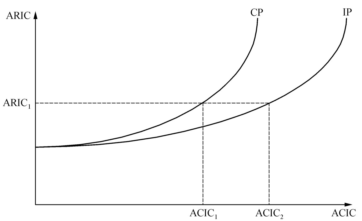 在图3-1中,纵轴表示“农业资源投入系数”(Agricultural Resources Invest Coefficient, ARIC),横轴表示“农业综合增长系数”(Agricultural Comprehensive Increase Coefficient, ACIC)。CP曲线表示常规模式,而IP曲线表示集约模式。农业资源投入包括资本、土地、劳动、自然资源、技术和企业家才能等。所谓农业资源投入系数,指给定产量下的各种不同农业资源的投入量及其组合效率,该系数可以用来反映并表达特定发展状态下的农业生产率。在一般意义上,我们经常使用诸如“劳动生产率”、“资本生产率”、“技术效率”、“资源配置效率”这样的术语,这些实际是该系数的另一种表达方式。所谓农业综合增长系数,指给定资源投入下的农业产出量及其增长率。该系数经常被用来反映并表述特定发展状态的农业发展与增长效率。在多数情形下,我们所使用的诸如“农业总产值”、“农业附加值”、“农业总产值增长率”、“农业收入及其增长率”、“人均农业收入及其增长率”、“农村二、三产业增加值”、“农业综合要素成本”等,都是该系数的理论表述。从图3-1可以看出,在给定的资源投入系数下,两种不同的农业转型模式显示出不同的增长效率,两者的增长率差额称为“增长效应余额”(Increase Effect Difference),在图中表现为ACIC 2 和ACIC 1 之间的差额。