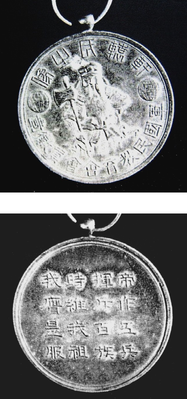 徽章正面刻有“轩辕氏[黄帝]之像”,中央是黄帝像浮雕。徽章反面有“帝作五兵挥斥百族时维我祖 我膺是服”之赞文。这幅黄帝浮雕像---无论从纶巾,还是斧戟、带饰、甲胄---一看便知和《二十世纪之支那》的线条画黄帝像如出一辙。