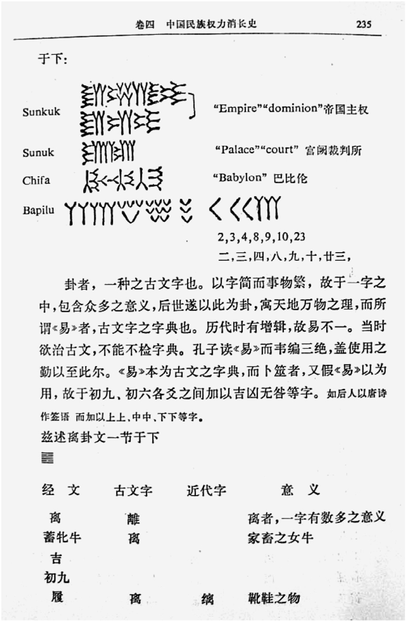 ,且未作只字说明。不用说,除少数古代东方学者外,无人会去翻阅拉库伯里浩繁的原著,或者试图确认楔形文字图的出处,因此,对于日本及中国读者而言,《支那文明史》的转述即全为拉库伯里学说,也全部是史实。此类对西方学说既非概括、亦非编述的加工,是明治日本接受西方思想时的常见现象,而绝非仅有《支那文明史》的年轻作者为之。但远在伦敦的一位东方学者的新奇学说,经过介绍者追加“旁证”后,却不仅为许多中国知识分子所接受