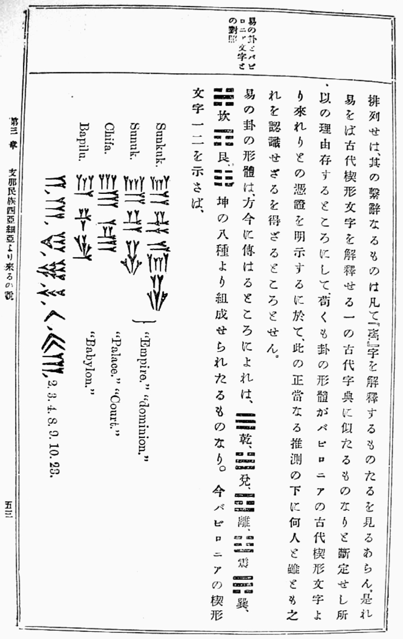 之所以如此,其一是拉库伯里的观点本身令人意外,即汉民族源自西方,而且是古巴比伦这一既陌生离奇、又足可激发研究兴趣的文明之地;其二是该书对拉库伯里所作解说的明显的“科学性”,如以插图形式比较《易经》卦象与刚刚解读成功的楔形文字的类似之处等。众所周知,古代西亚的楔形文字在19世纪中叶经英国人罗林森(Henry C. Rawlinson)成功解读贝希斯敦(Behistun)铭文之后,便被视为解读人类史的特殊文字而备受全世界关注。附言之,一般认为,日本开始包括楔形文字解读在内的古代东方学研究是在第二次世界大战之后,最早也只能追溯到1917年出现后不久即消逝的名曰“巴比伦学会”