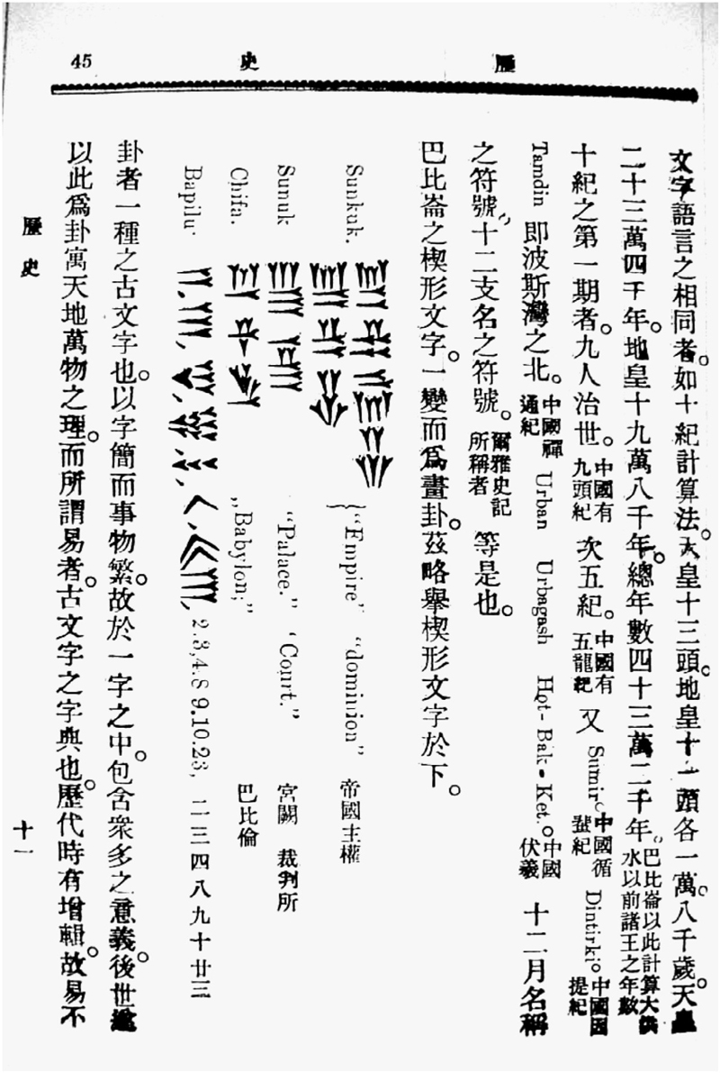 的同好会;由此可知,《支那文明史》插图介绍楔形文字,实属例外。中国知识分子通过该书初次看到传闻中的楔形文字,且其所附对译暗示与中国古代文字类似,所受心理冲击之大可想而知。中国主要在1904年前后依据《支那文明史》撰写、发表的文章,对其插图青睐有加,争相转载(见插图),这表明了《支那文明史》---及其所转述之拉库伯里学说---的魅力所在,同时也如实反映了当时的所谓“新知识”是通过不断复制而成立的。