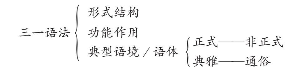 当然,如上文所述,谈句子的功用离不开场景,而句子(或句型)使用的场景不止是日常生活的,同时还有工作的、会议的、对外国人的、对领导的等等不同话语场所。三一语法在教学中要考虑的功能语境至少要包括语体的内容。因此,三一语法的基本框架包括以下内容: