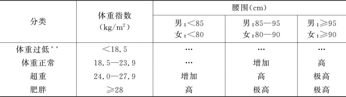 表4.1 中国成人超重和肥胖的体重指数和腰围界限值与相关疾病 * 危险的关系。