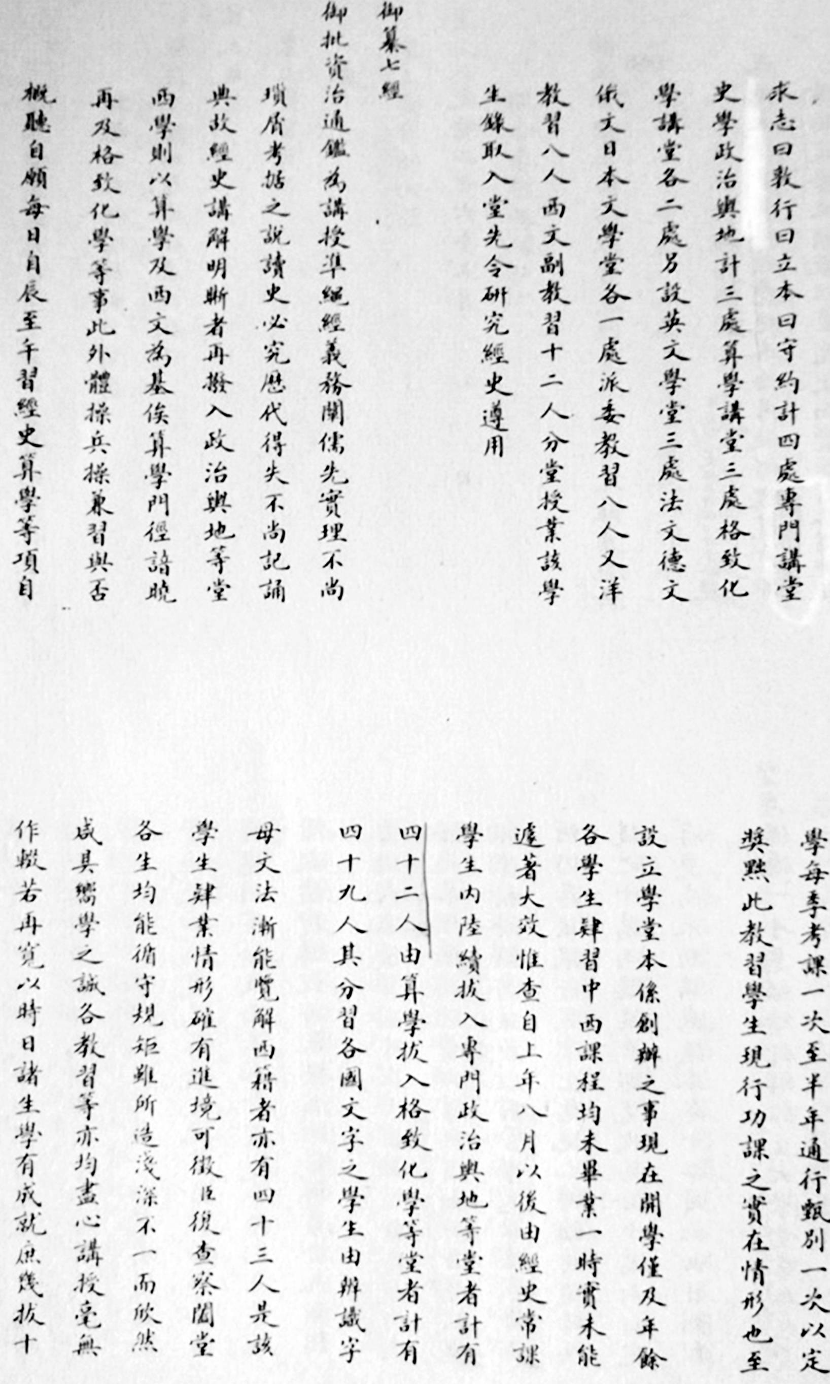 。吏部左侍郎许景澄在《奏覆大学堂功效折》里说,“自上年八月(指1899年9月)以后,由经史常课学生内陆续拔入专门政治舆地等堂者计有四十二人,由算学拔入格致化学等堂者计有四十九人”