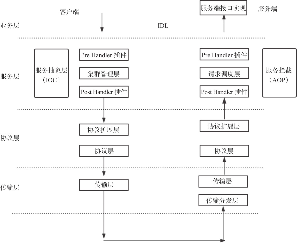 Thrift服务治理整体架构如图1-1所示,分为业务层、服务层、协议层和传输层4个部分,其中业务层是服务的业务逻辑实现,客户端和服务端通过IDL接口进行交互,对开源Thrift的扩展与增强通过服务层、协议层和传输层来完成。