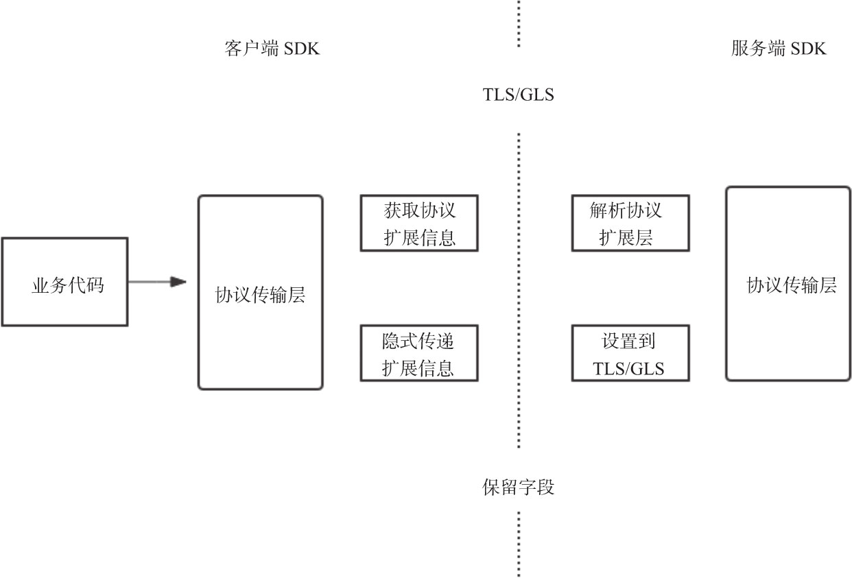 在客户端增加了协议装饰层,协议扩展信息通过TLS的方式统一维护,协议装饰层通过TLS获取扩展信息后,使用保留字段序号0,和业务请求一块打包,隐式传递到对端。
