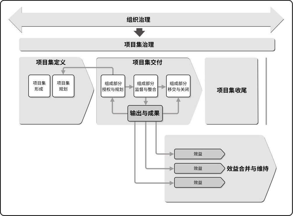 图 1-1 所示的项目集生命周期表明了项目集交付阶段的非时序性质。在项目集中,通过迭代实现的各组件所产生的输出流和成果流需要对组织效益有所贡献。项目集效益可能会在整个项目集实施期间增量地实现,也可能在项目集结束之时或之后方可实现。本标准第7章将详细探讨项目集生命周期。